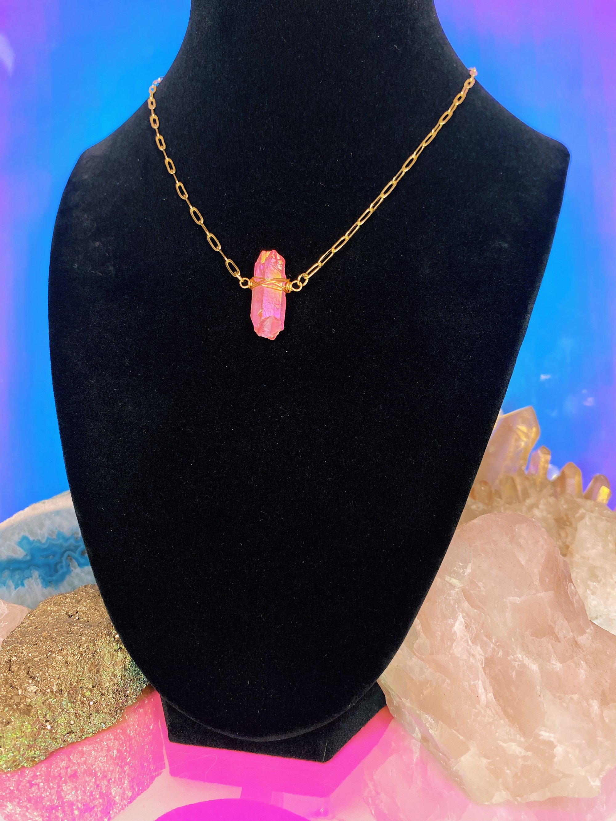 Necklace containing a wire wrapped Pink Angel Aura Quartz on a gold plated paperclip chain. Chain length is 16 & 1/2" with an extension chain for up to 18" but can be modified to any size upon request via note at checkout.
