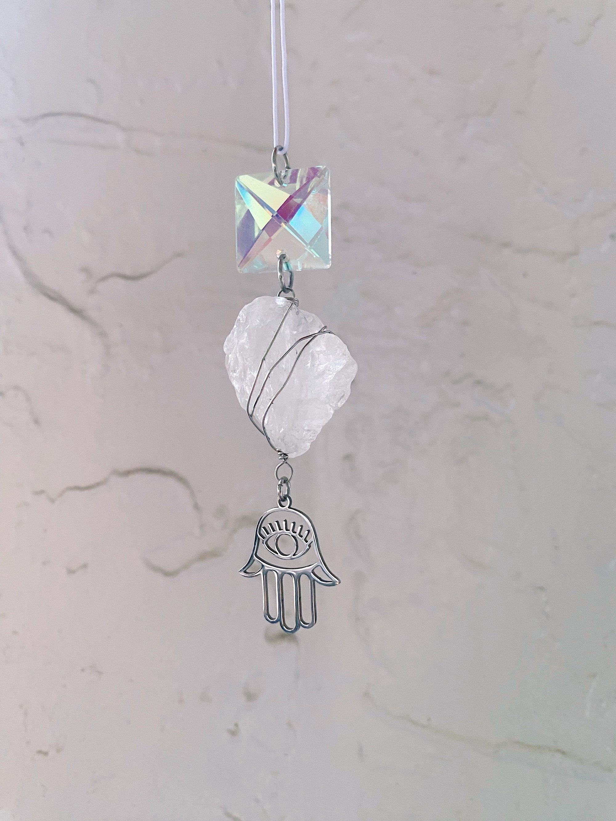 Car charm/suncatcher containing a stainless steel wire wrapped Quartz with an accent aurora borealis crystal glass connector and a stainless steel hamsa component.